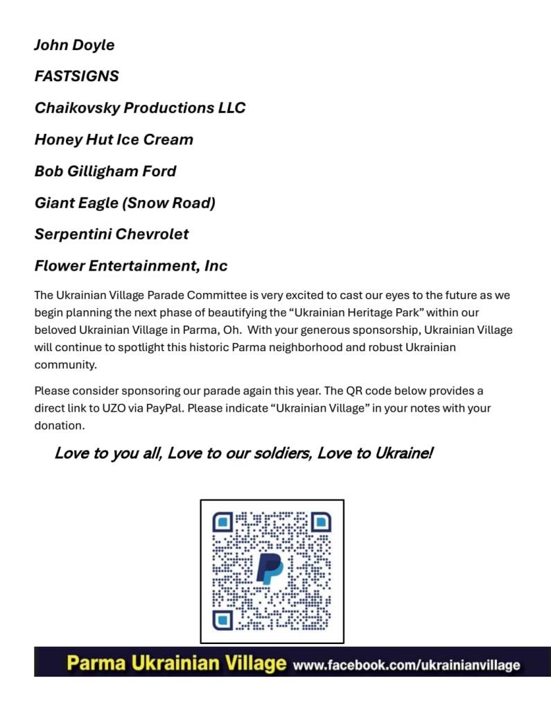 Please donate by Sunday 8/11/2024. A QR code (for easy donation) can be found listed below along with the sponsor funding levels. When the QR code opens to the PayPal app please be sure to add a note that this is for the Ukrainian Village Committee and the name you would like us to use in our program booklet acknowledging your generous support.